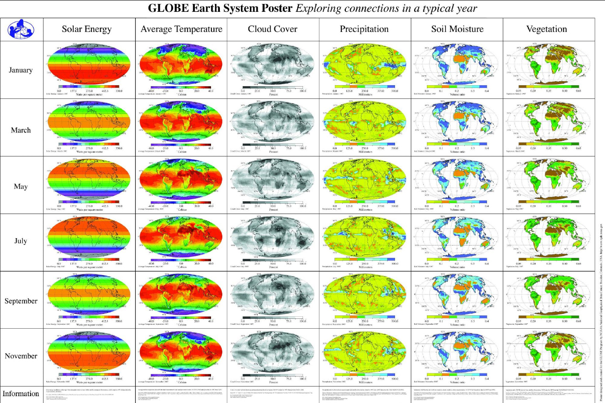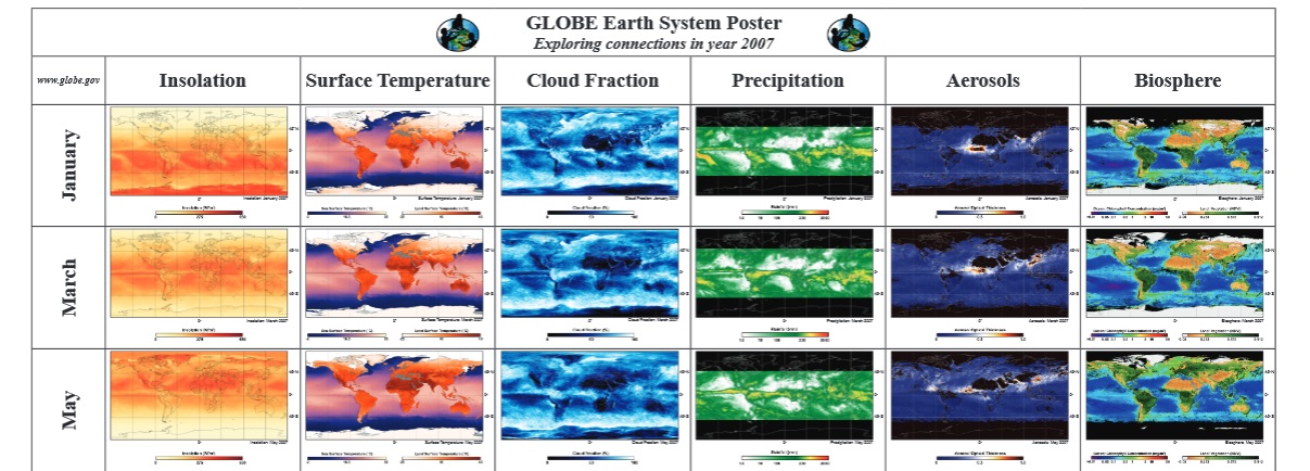 Learn how to identify global patterns and connections in environmental data with GLOBE's Earth as a System learning activities. By comparing and contrasting GLOBE poster images, students can explore the relationships between insolation and surface temperature, aerosols and wildfires, and much more. For an example on how teacher's have incorporated the Earth System Poster into their curriculum, see the learning activity from the Arctic and Earth SIGNS team.