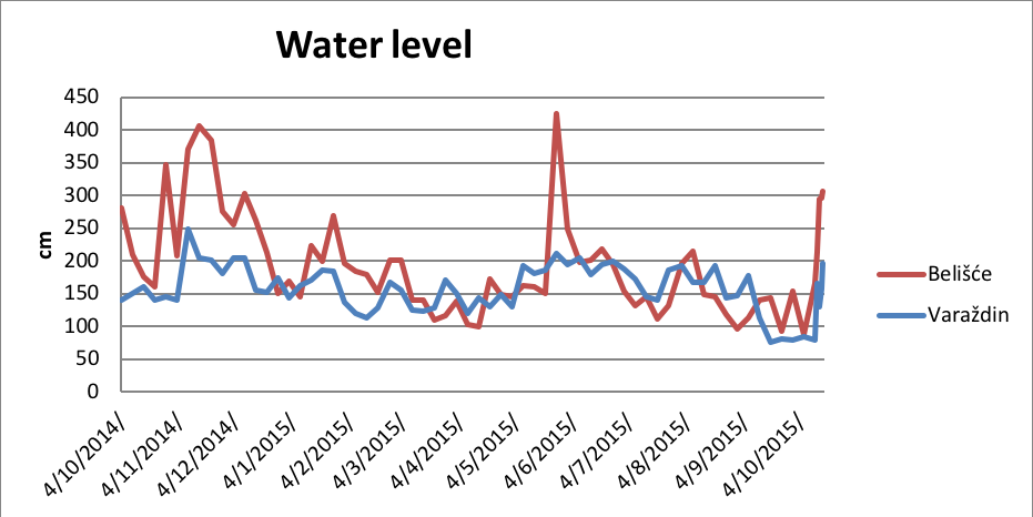 Chart 3. Temporal variation of water level of the river Drava at stations Varazdin and Belisce.
