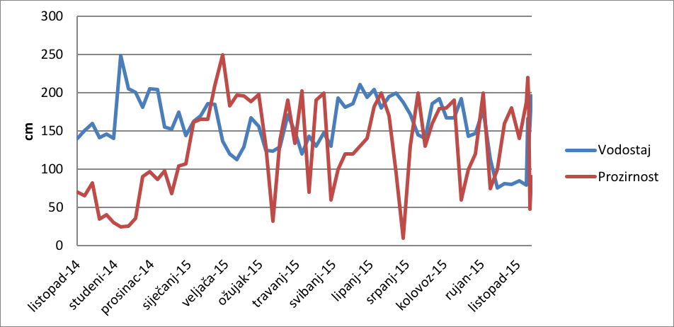 Chart 1 shows that the transparency of water was much higher at station Varazdin. The measured values were in the range of 10 cm up to 250 cm. The highest values of transparency were measured at the end of December and in January. Transparency was the lowest in October and November.