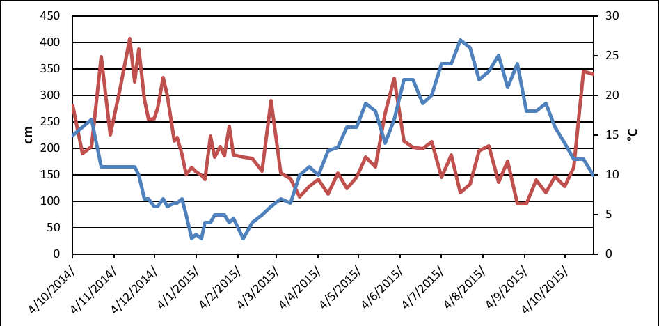 Charts 6 and 7 present the temporal variation of water level and water temperature for both measuring stations. An inverse proportionality of the water temperature and water level was observed throughout the year. Practically, when water level increases, water temperature decreases and vice versa.
