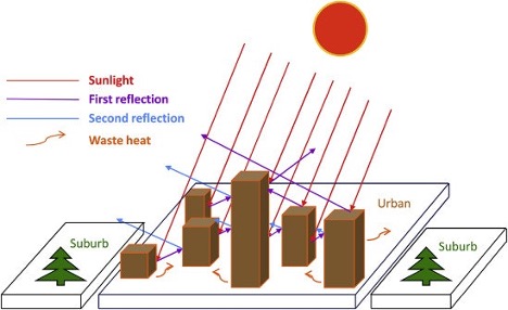 Diagram of the light/energy transfers that cause the urban heat island phenomenon. Light is converted to heat when it is absorbed, and this waste heat is trapped by the heat island. Additionally, light can be reflected several times between tall buildings, resulting in additional heat absorption. (Ren, 2015)