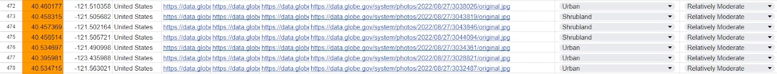 After selecting the sample points, the next step was to analyze the land cover at each location. Each row in the dataset contained the source code for an image, which we manually reviewed to identify the land cover type. The land cover categories included urban, forest, wetland, grassland, and shrubland. This detailed analysis allowed us to connect specific land cover types with corresponding wildfire risk levels, providing valuable insights into how different environments influence fire susceptibility. This process showed the importance of manual verification in ensuring data accuracy and reliability.