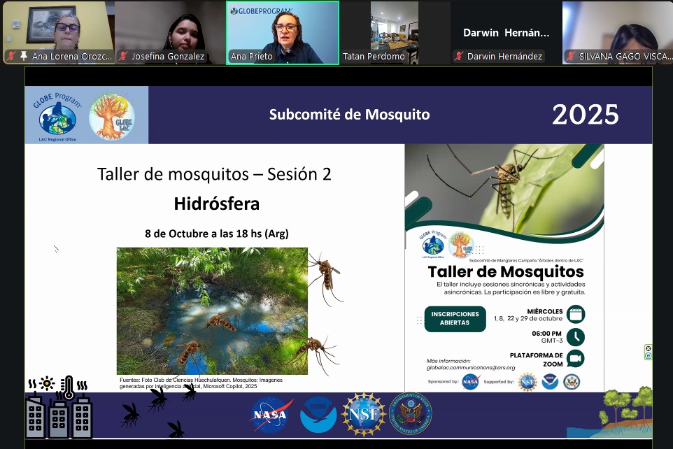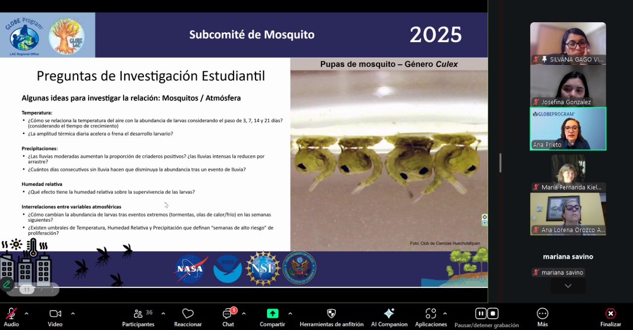 The workshop was opened by Mariana Savino (Coordinator of the GLOBE LAC Regional Office), who thanked the campaign committees for their work. The session continued with an introduction to the GLOBE Program led by Ana Lorena Orozco (GLOBE Coordinator of Costa Rica), and concluded with a presentation by Ana Beatriz Prieto (Mentor Trainer from Argentina), who discussed the relationship between the GLOBE Atmosphere, Biosphere, and Hydrosphere protocols and mosquitoes. She emphasized the importance of addressing this topic, introduced the GLOBE Observer Mosquito Habitat Mapper app, and facilitated a group discussion on potential research project ideas related to the theme.